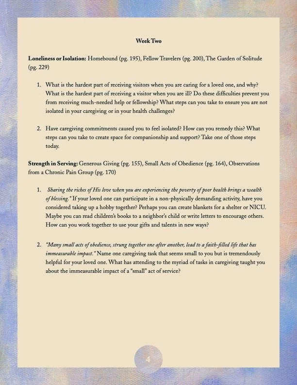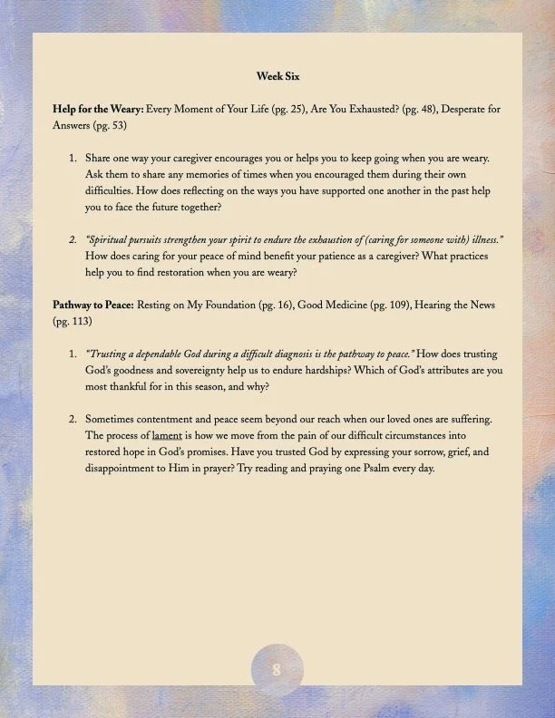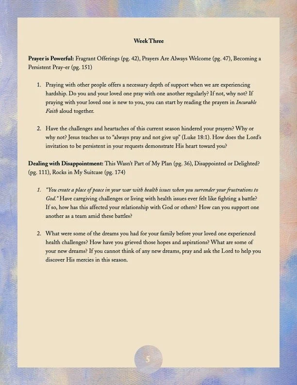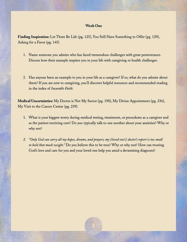 I’ve created a free Incurable Faith caregiver guide to encourage and uplift those who help others. Those who prefer to print a downloadable pdf may use this link: Incurable Faith Caregiver Guide. Please feel free to forward this guide to anyone who might benefit from it!